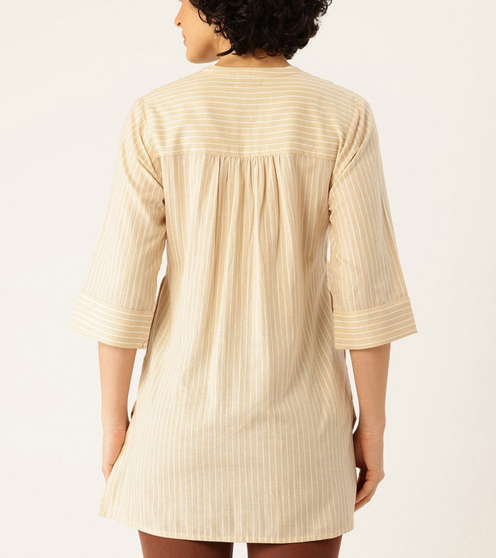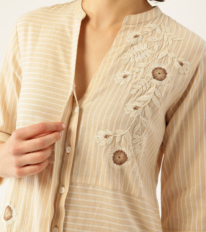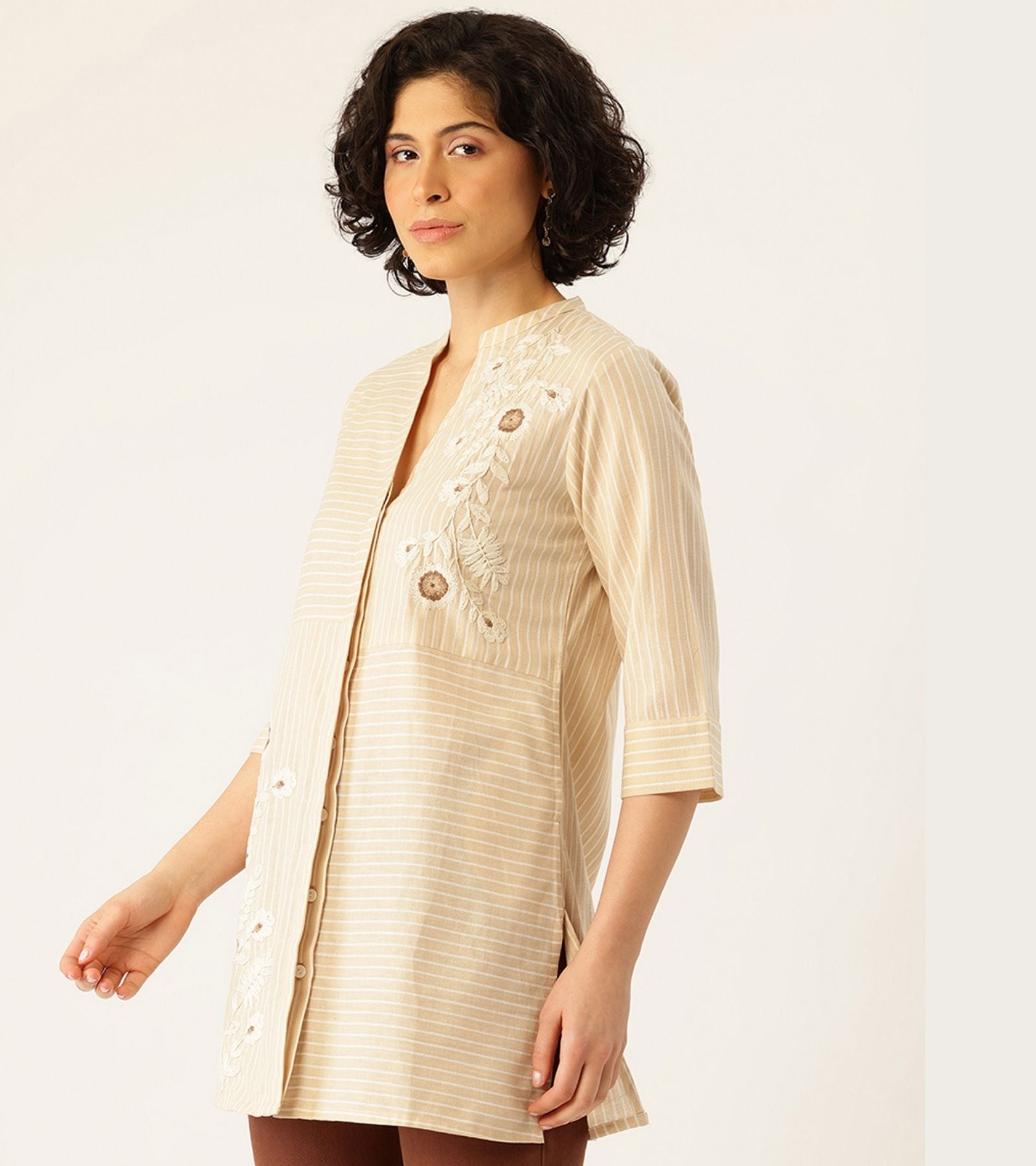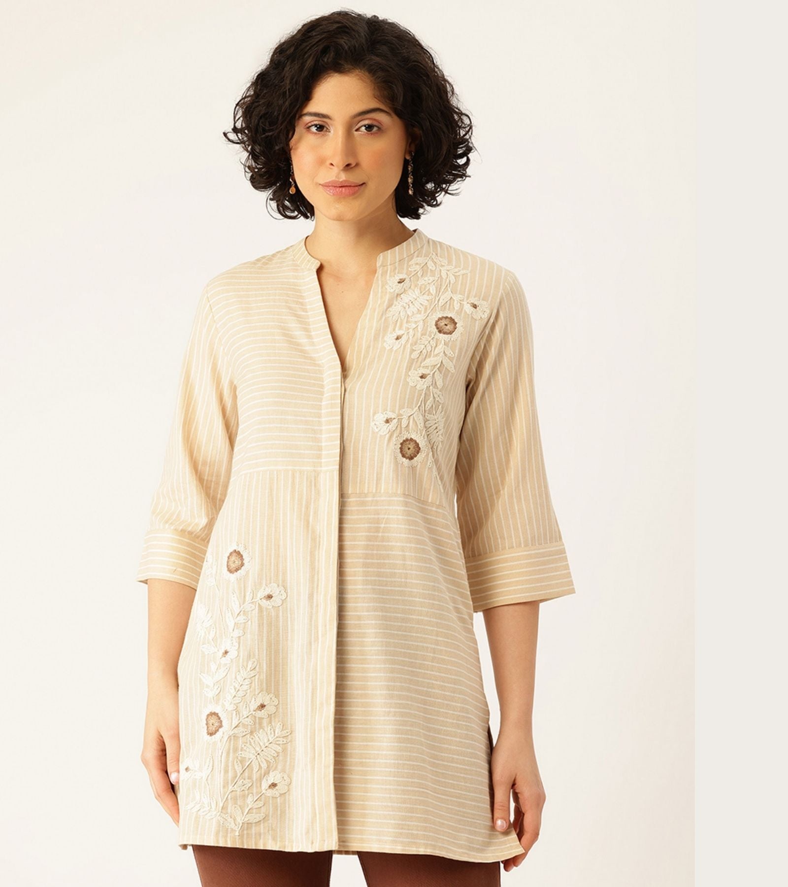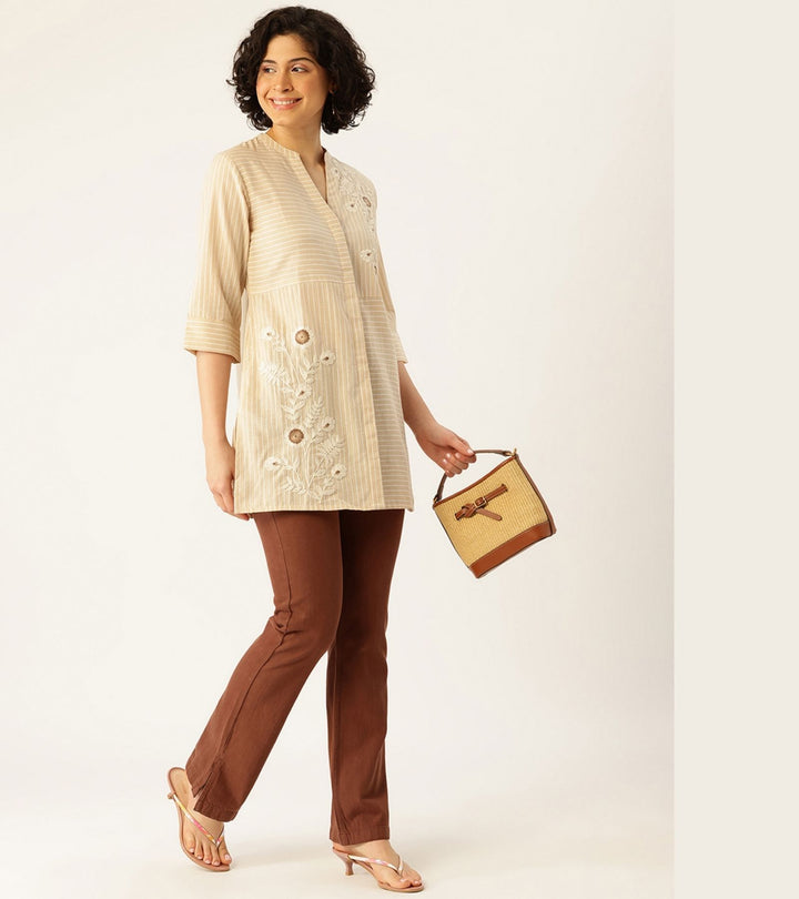 Elevate your casual wardrobe with this elegant beige striped tunic featuring delicate floral embroidery.