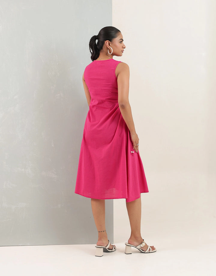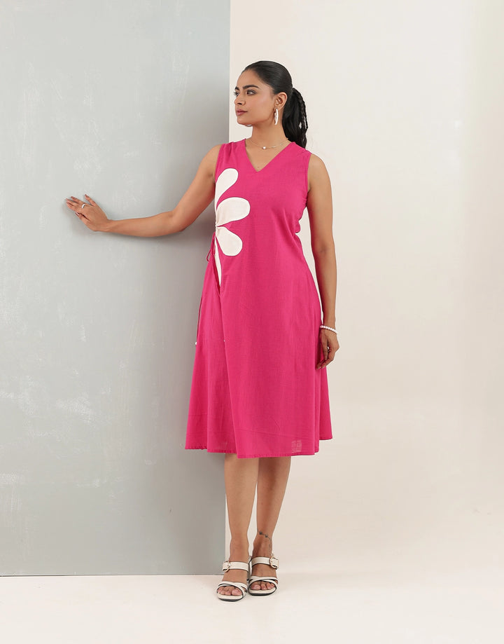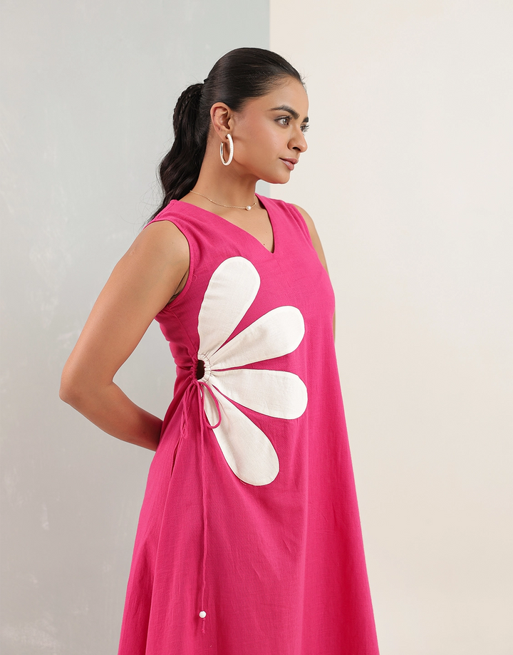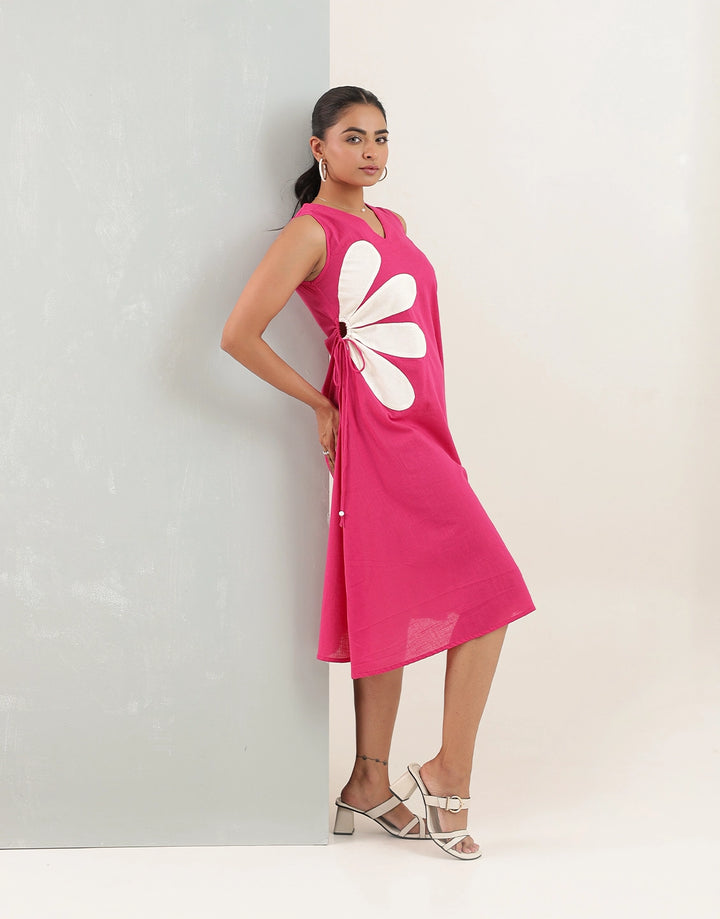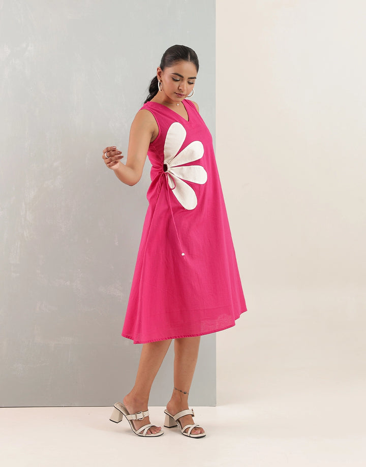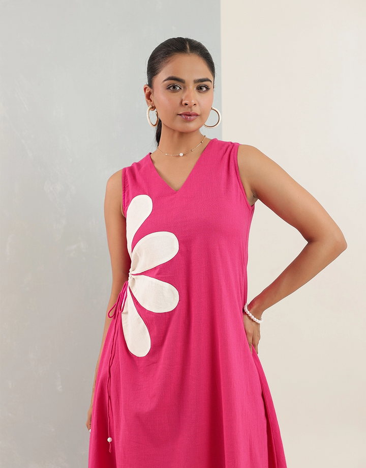 Bright and playful, this sleeveless pink A-line dress features a bold off white floral applique with drawstring detail, offering effortless style for casual days and summer outings.