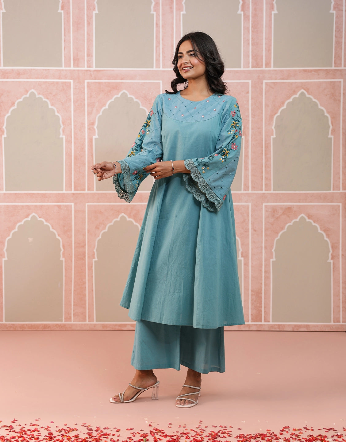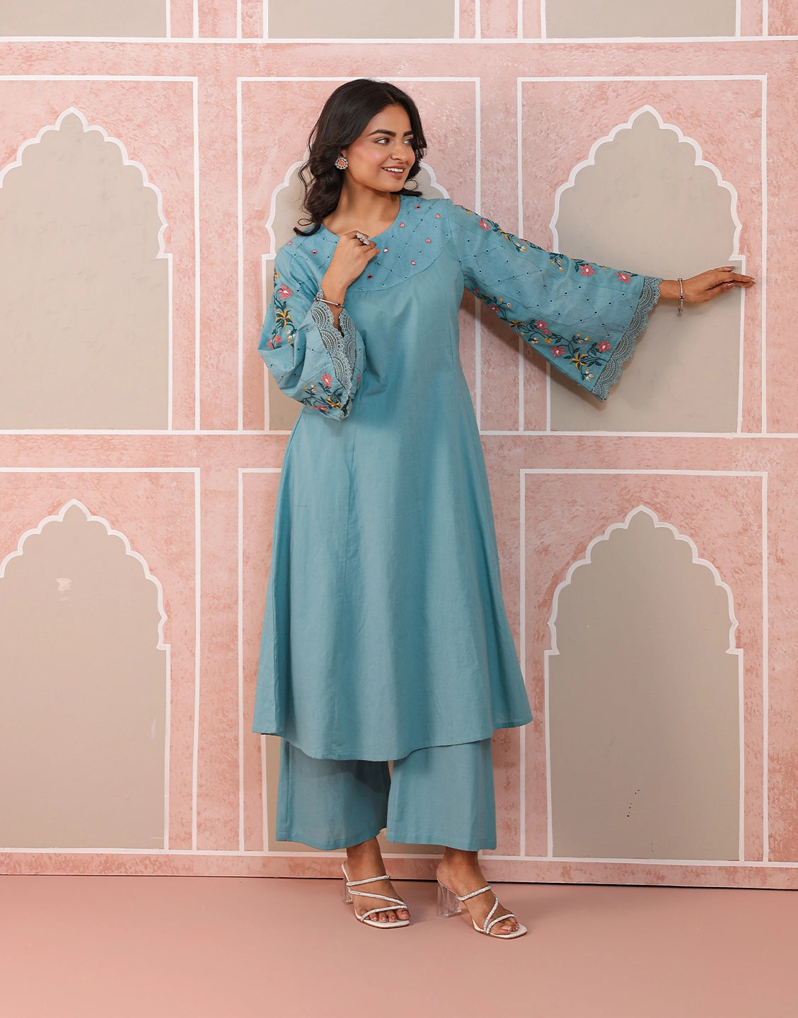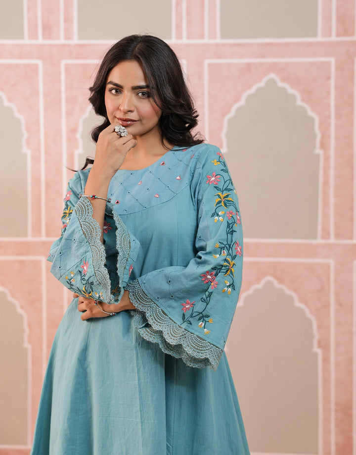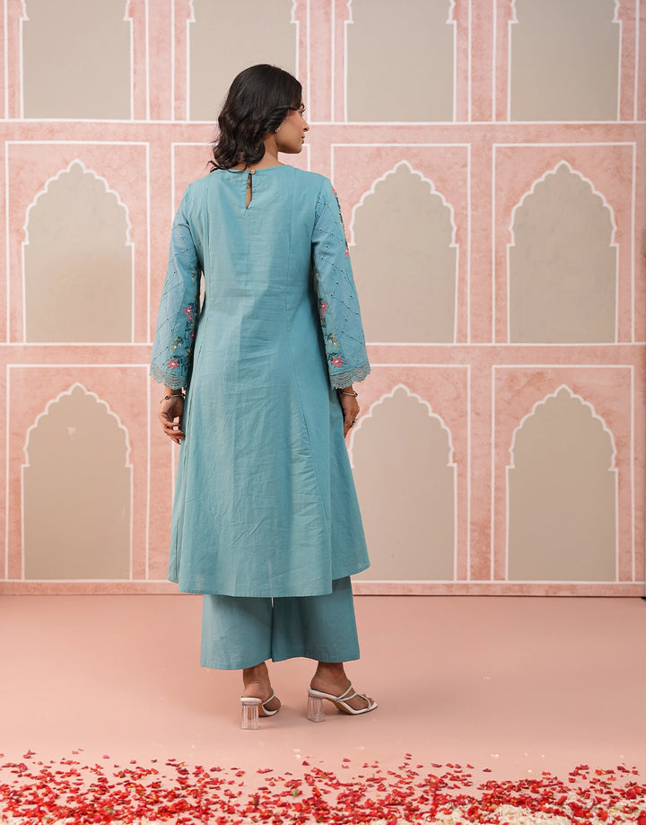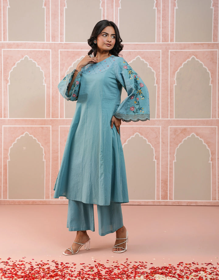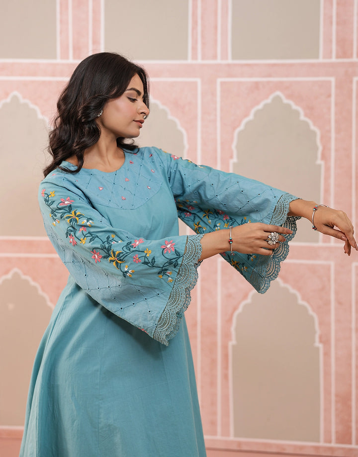 Breathe new life into your ethnic style with this chic aqua blue kurta set, adorned with delicate floral embroidery and crafted in soft, airy cotton.