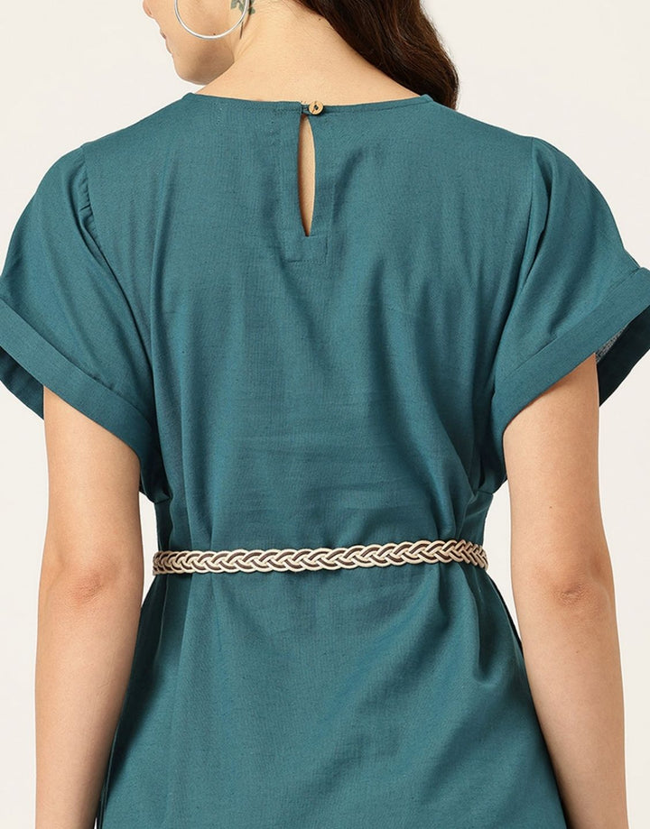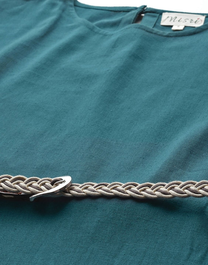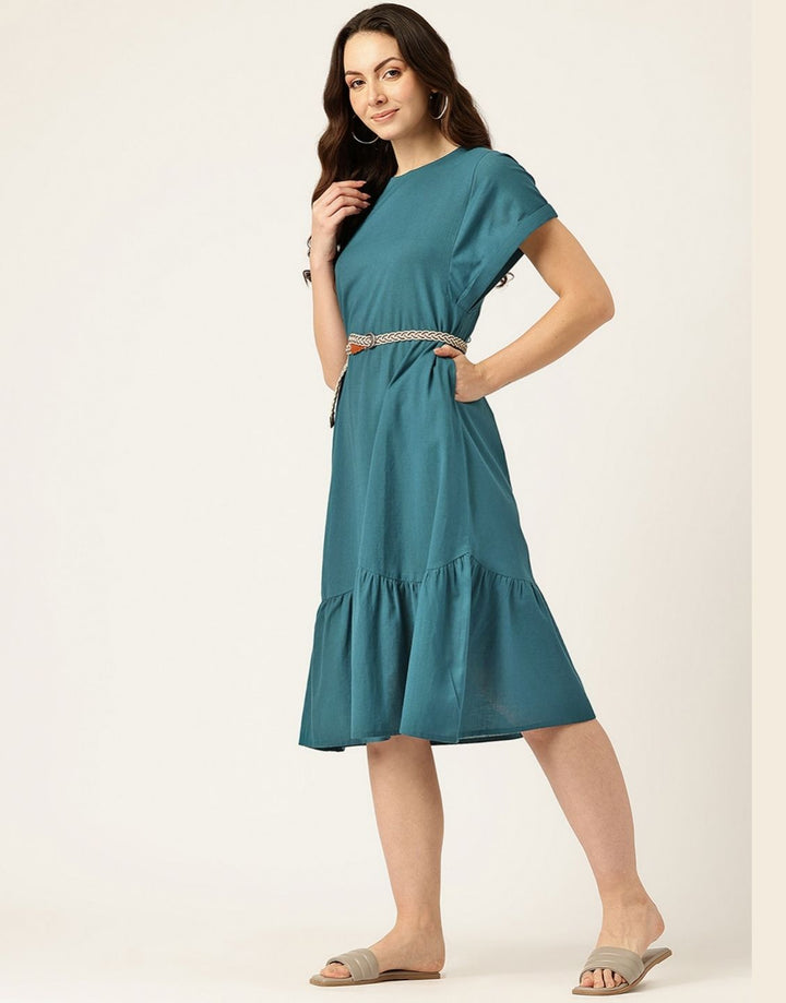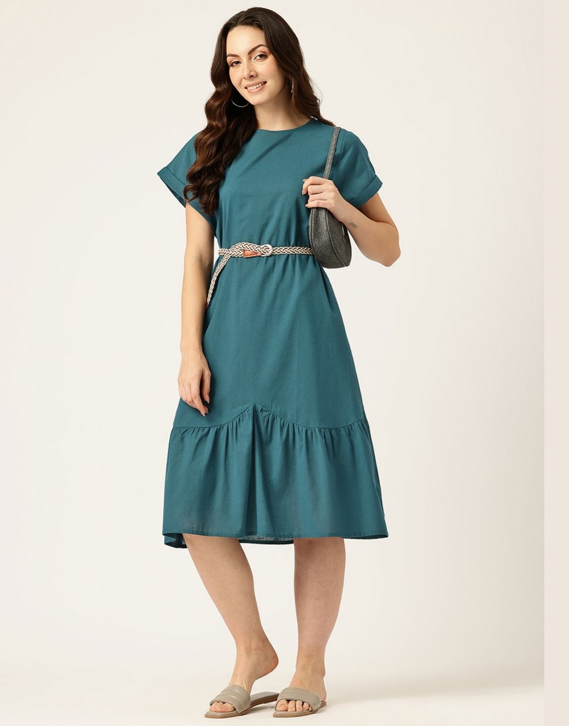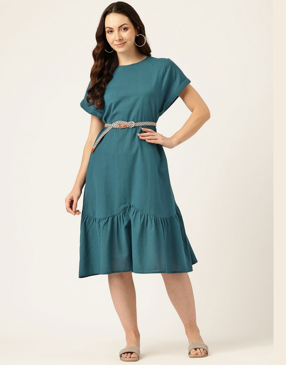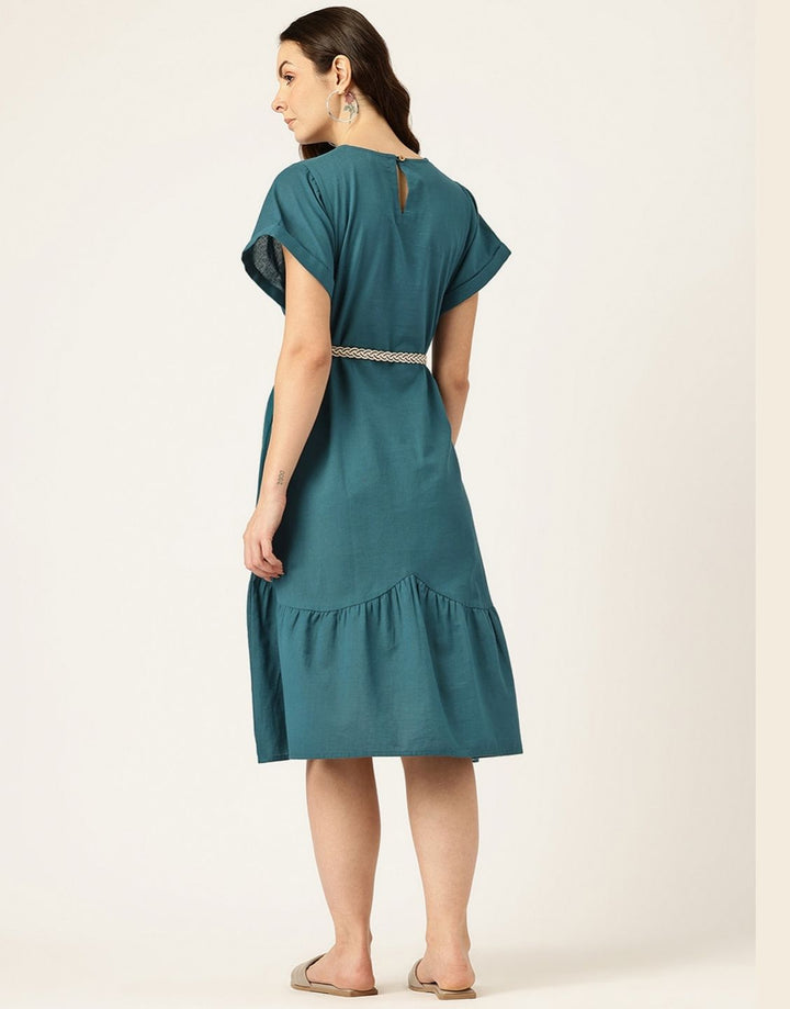 Teal blue cotton midi dress with a braided belt, round neck, and relaxed fit — perfect for effortless everyday style.