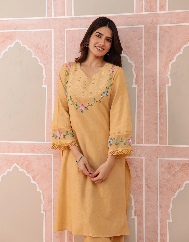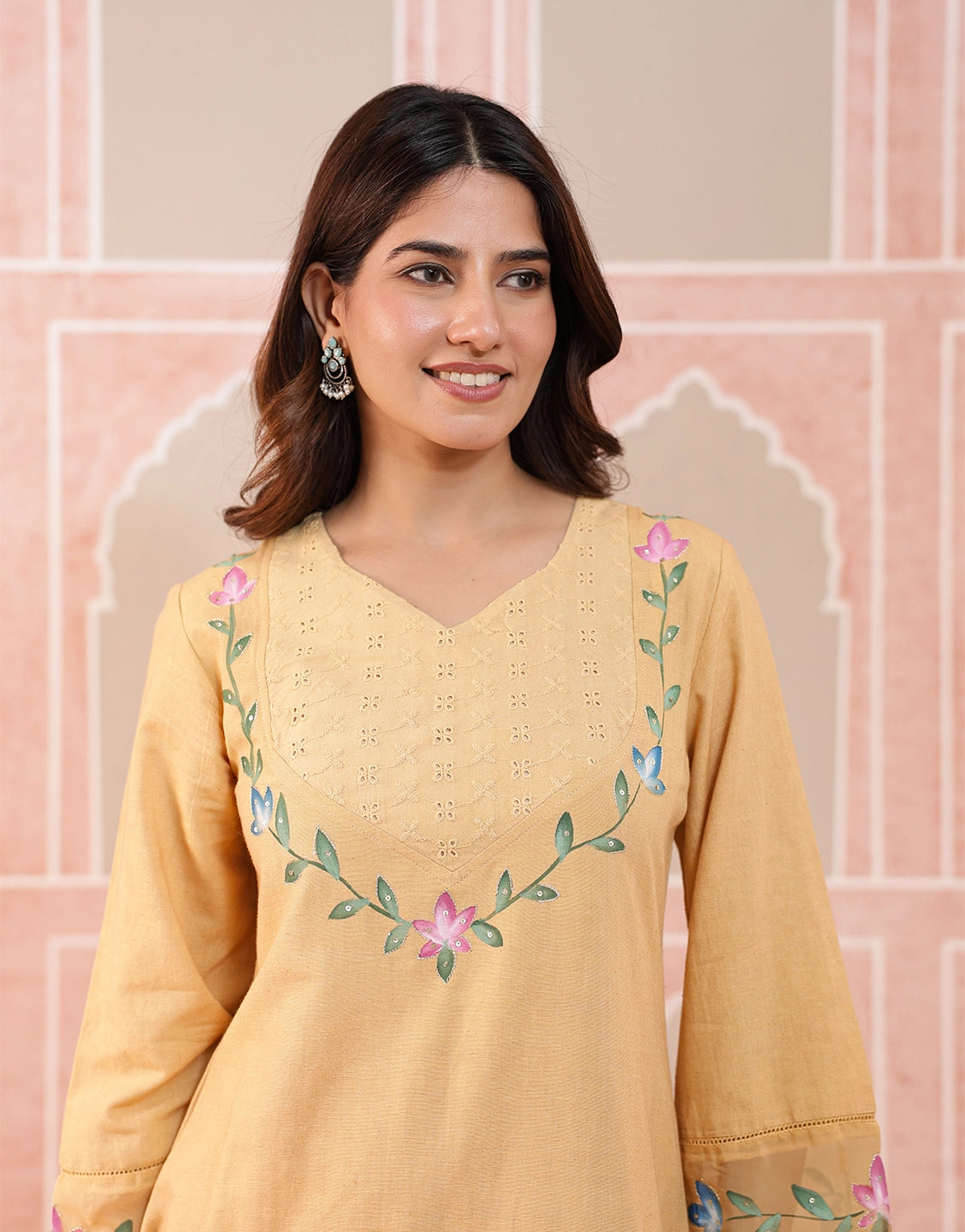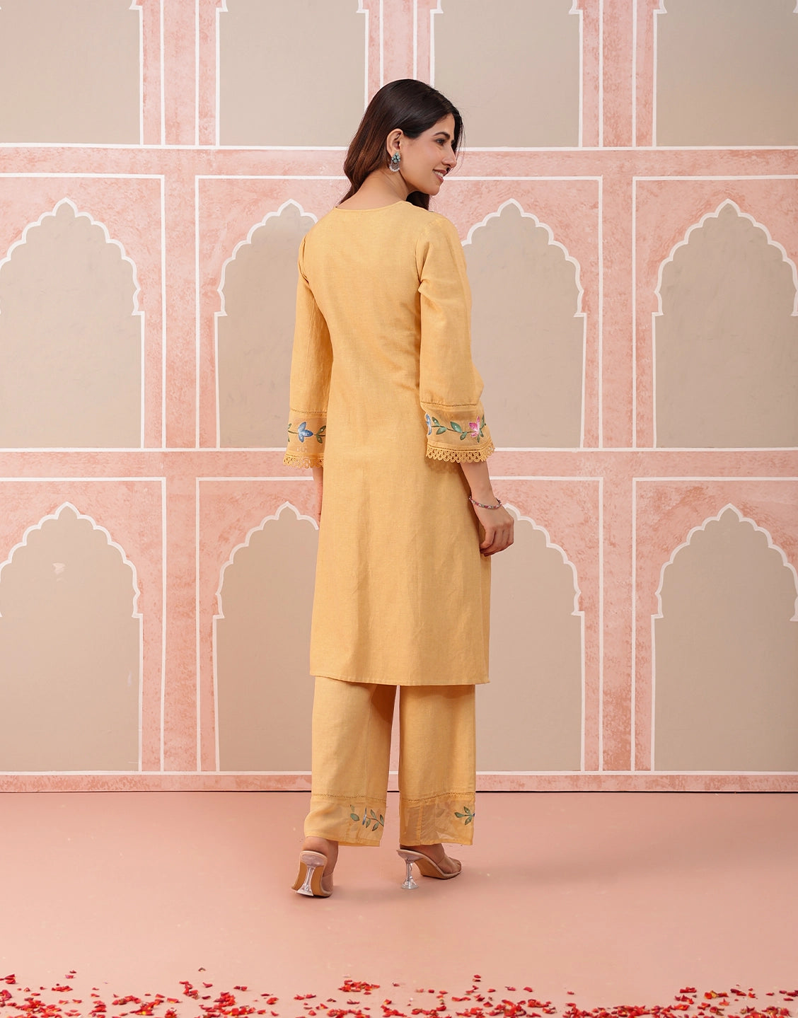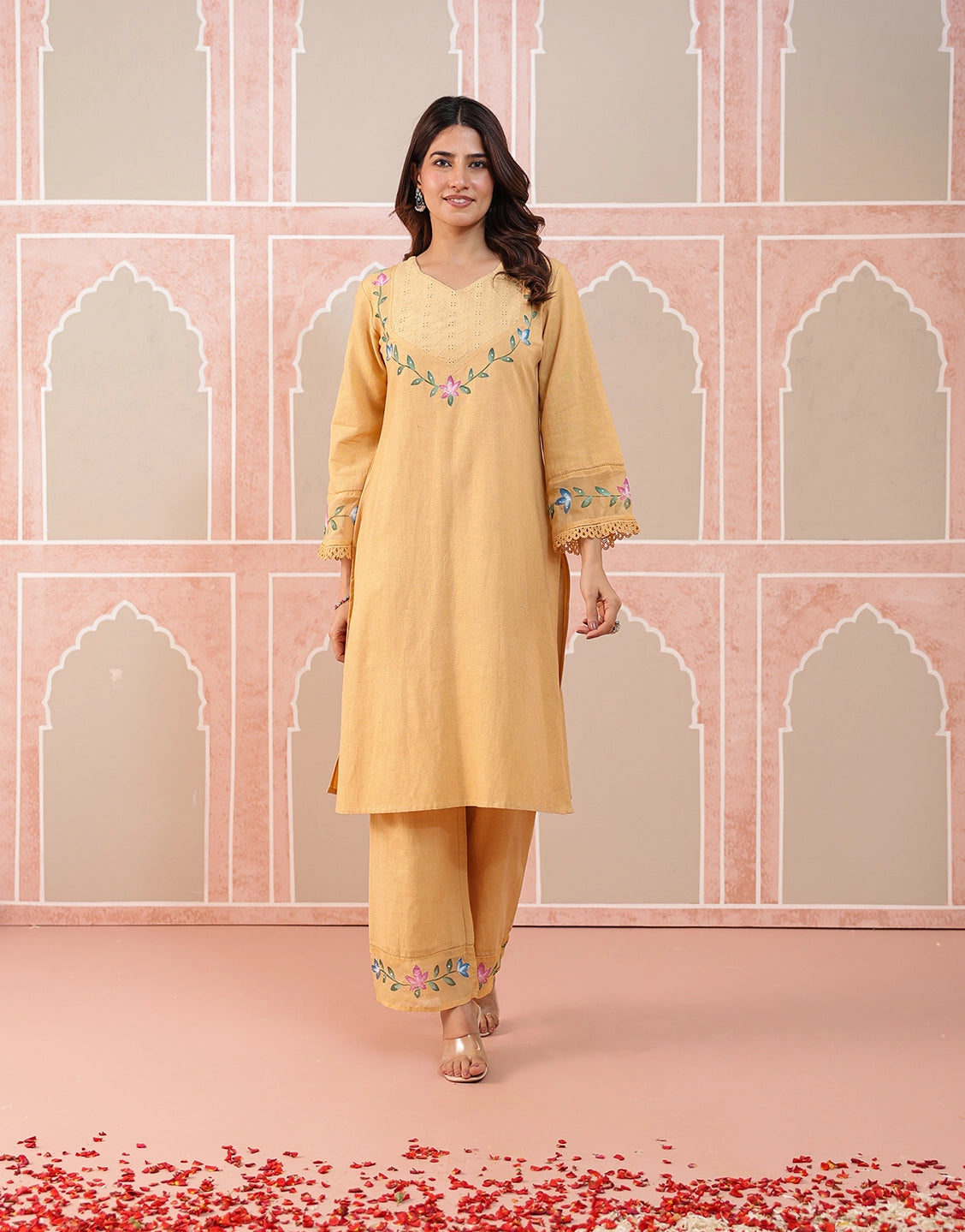 Floral hand brush paint on neckline, sleeves & hemline of pants