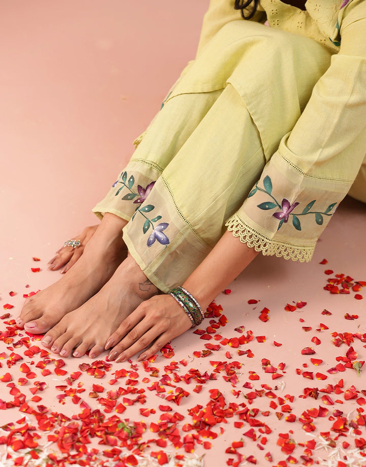 Floral hand brush paint on neckline, sleeves & hemline of pants