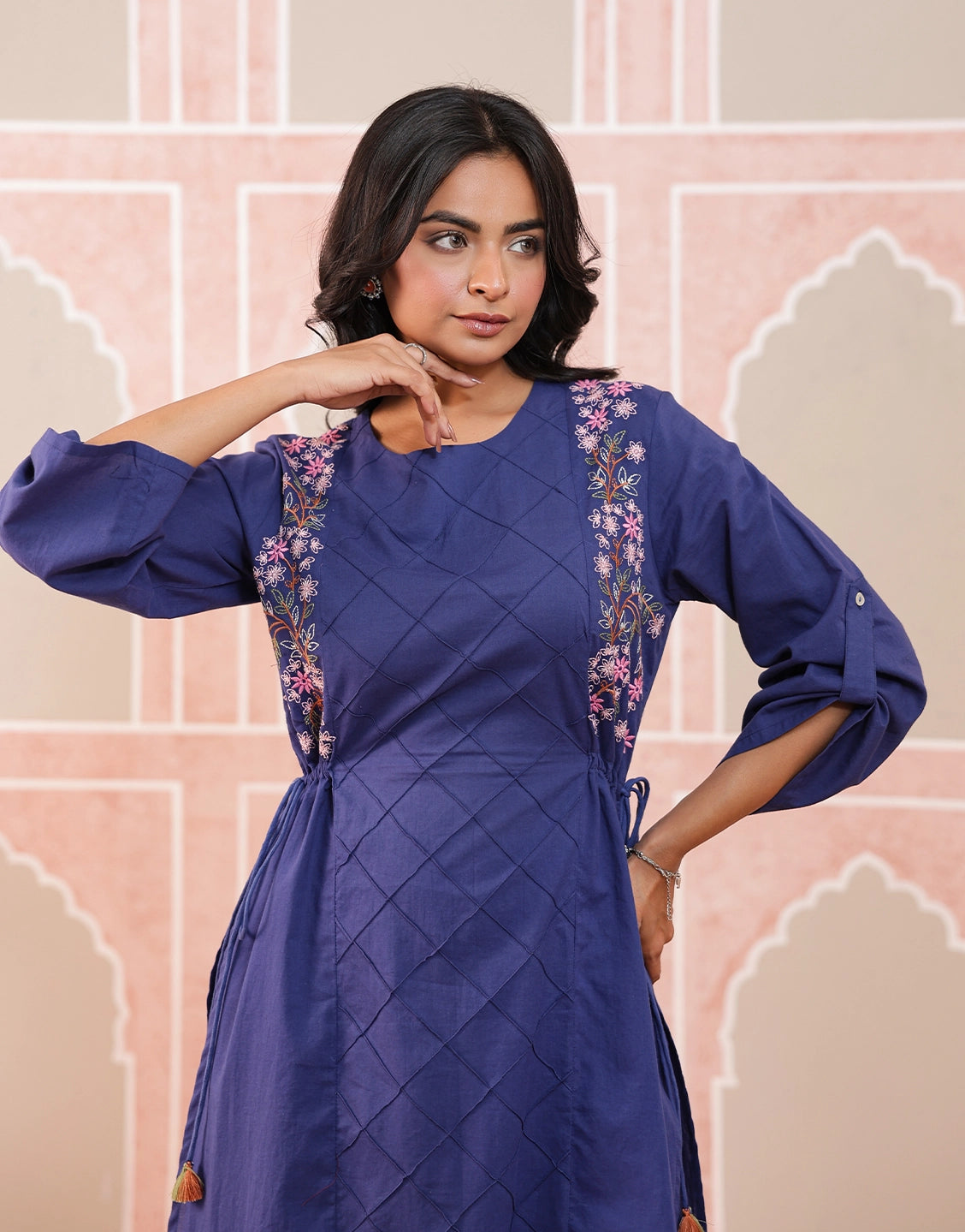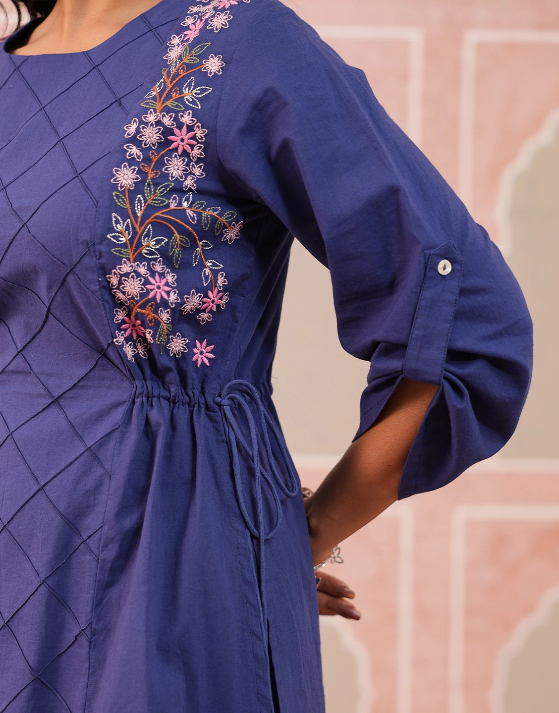 Side floral embroidery with diamond-pattern stitch detail