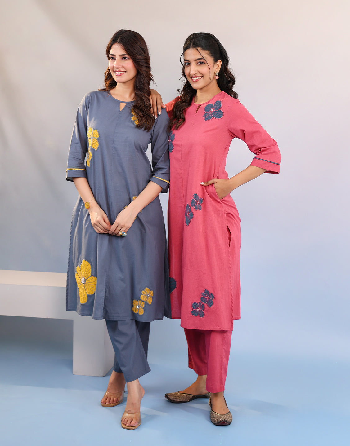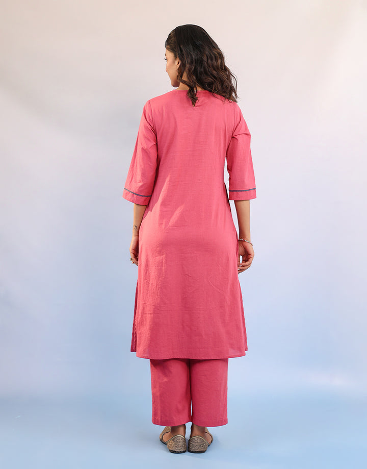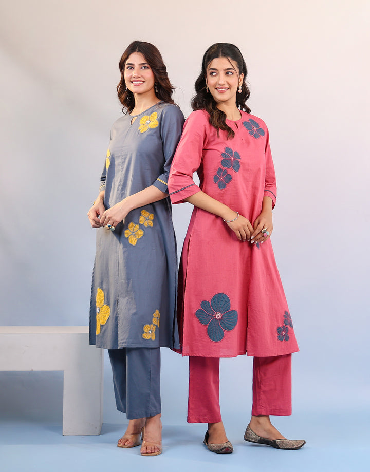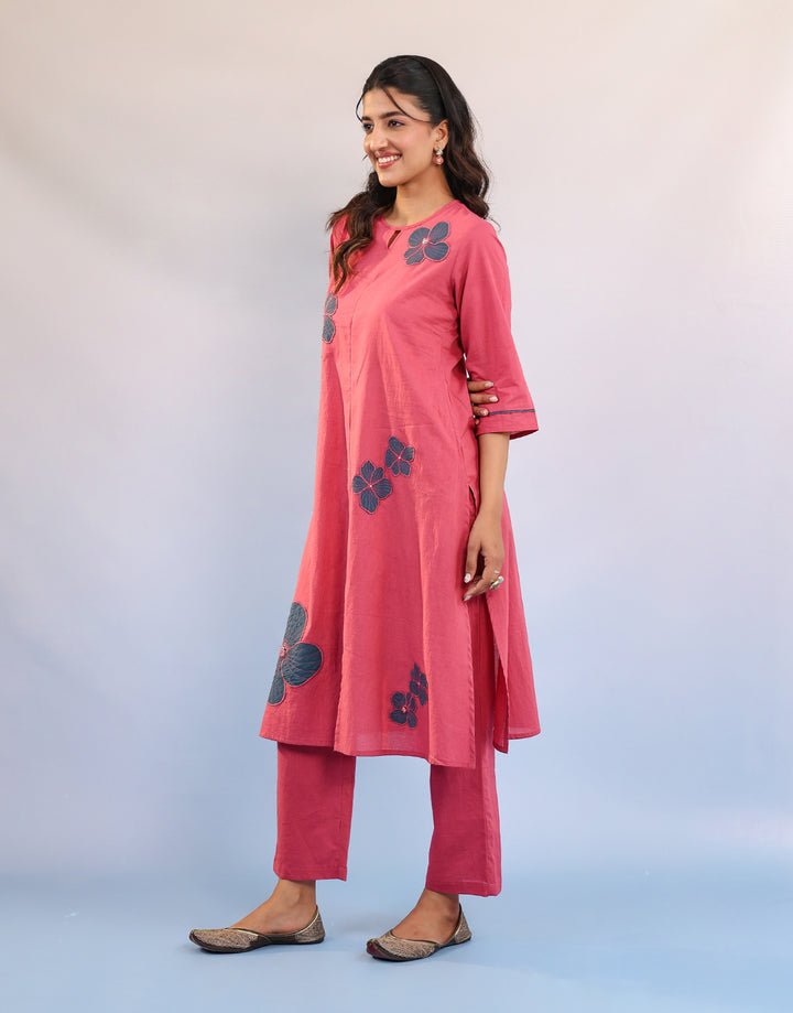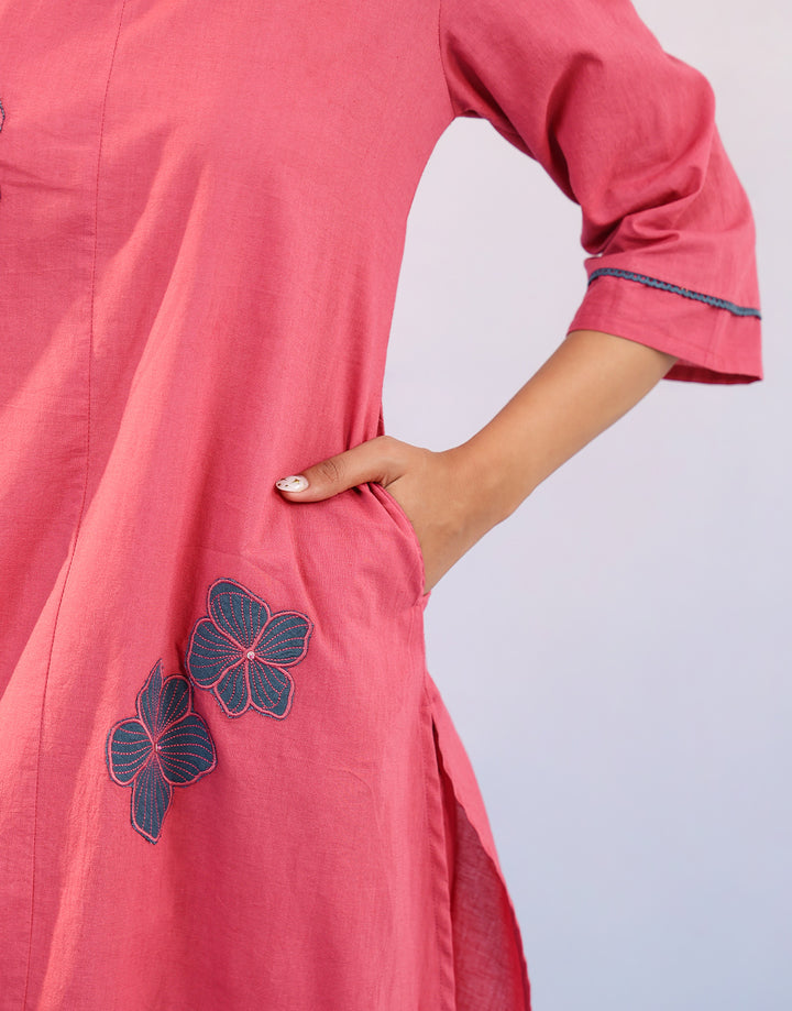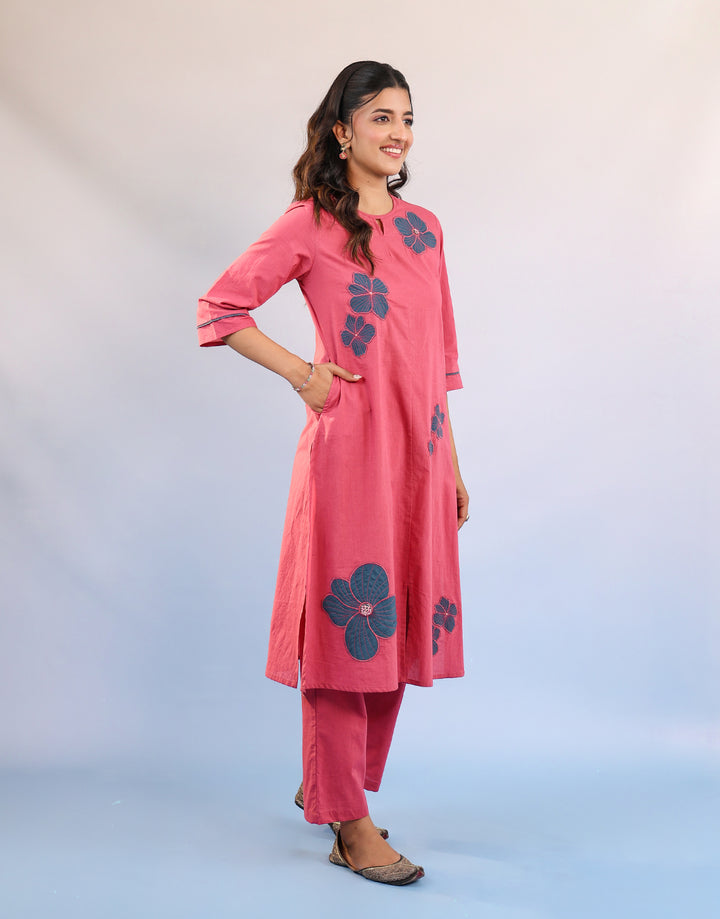 Pink cotton kurta set with teal blue patch floral embroidery
