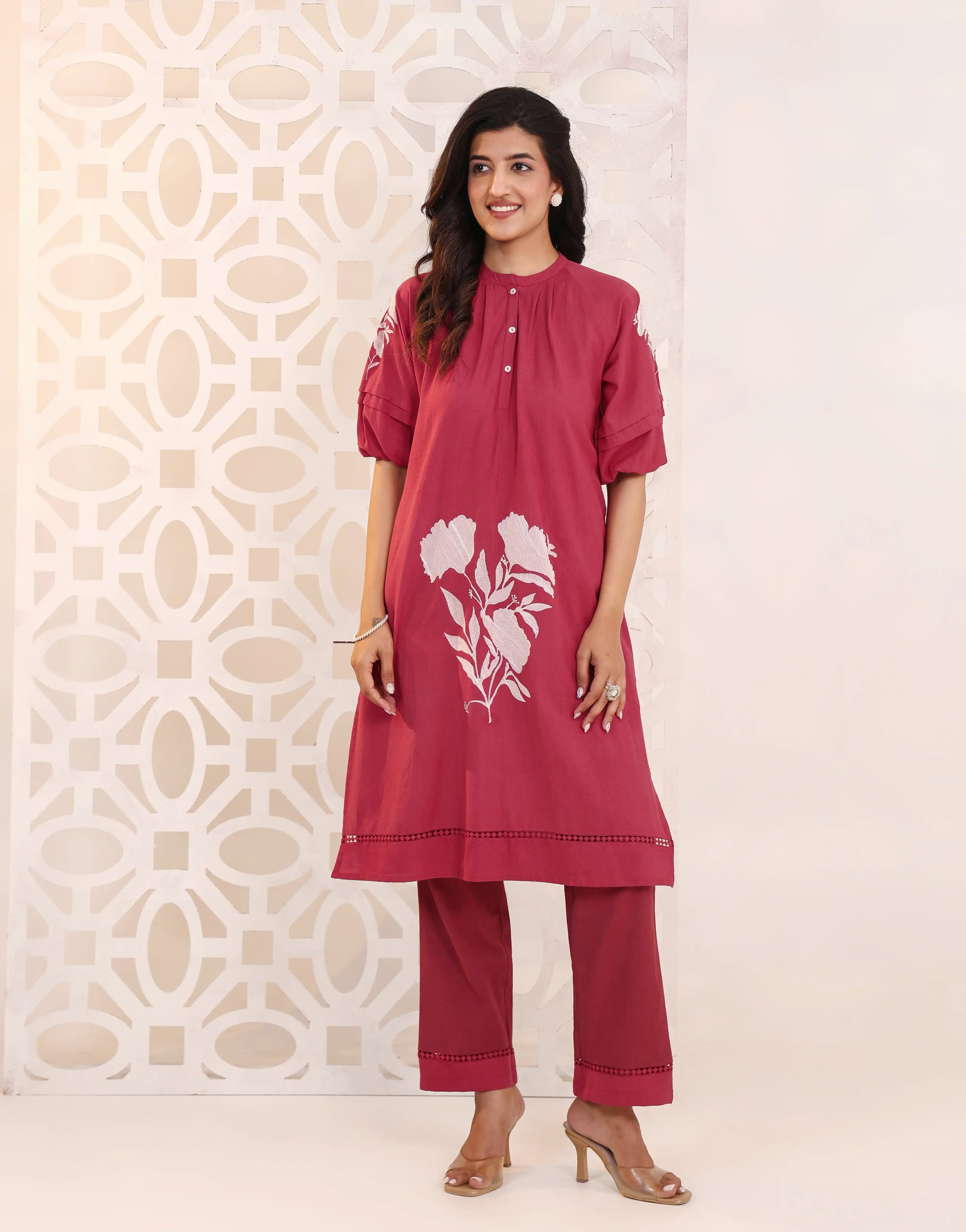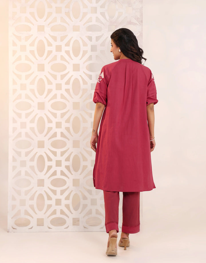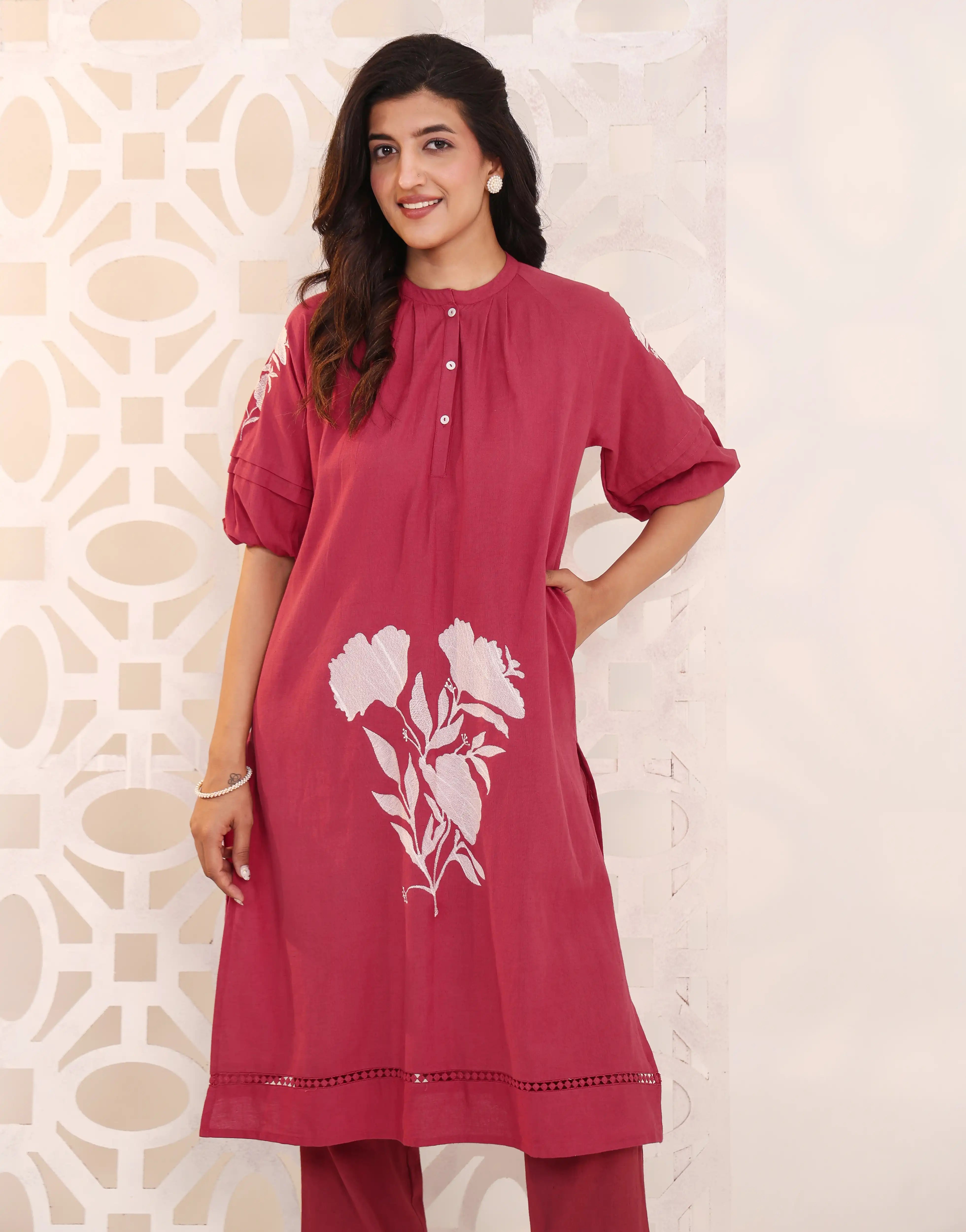Vibrant and elegant, the RIMAYA Rose Red Kurta Set features intricate floral embroidery, soft pleat details, and a flattering silhouette—perfect for festive evenings, family celebrations, and joyful gatherings.