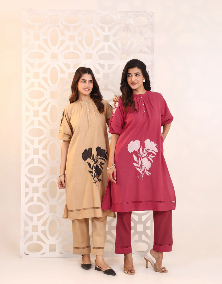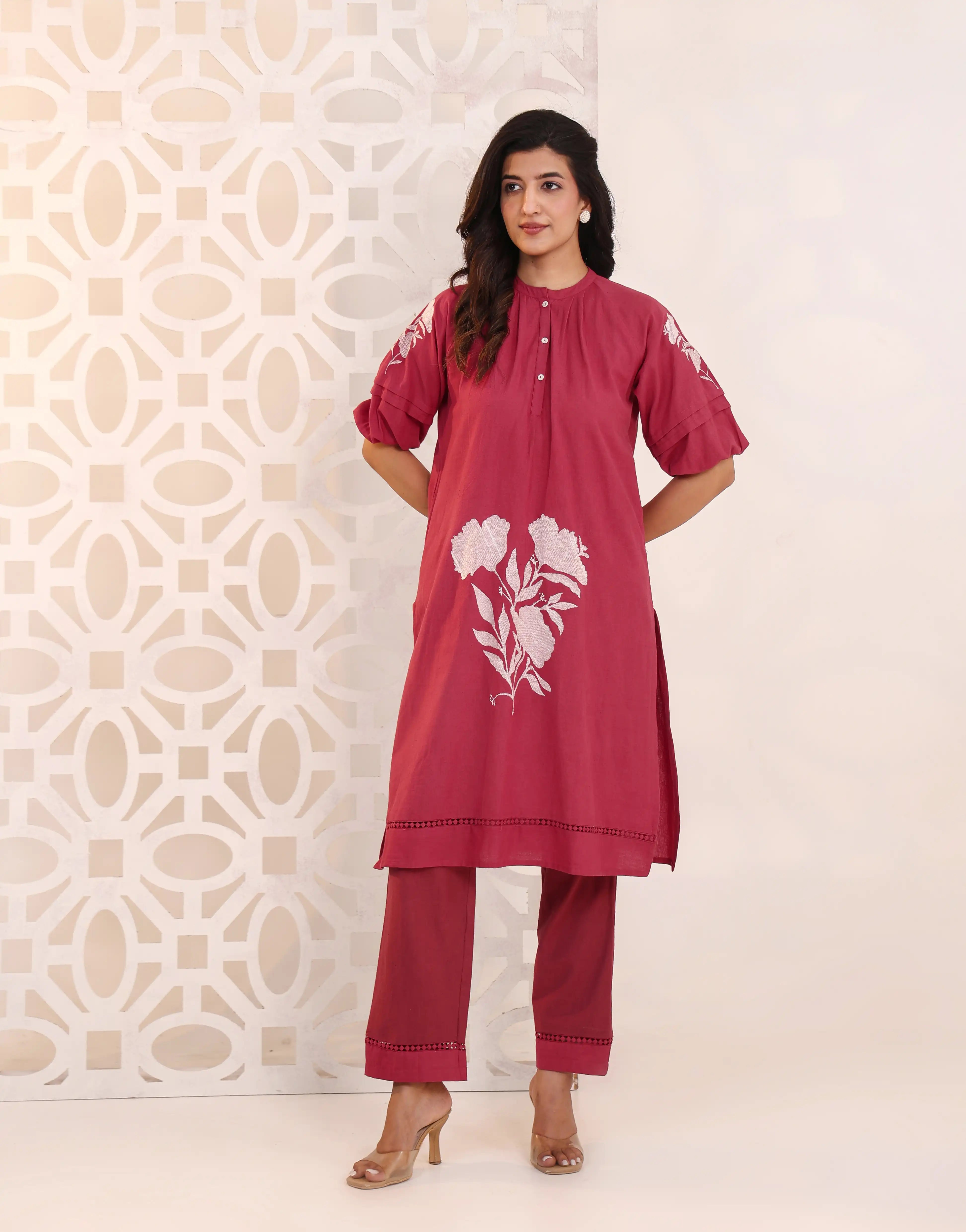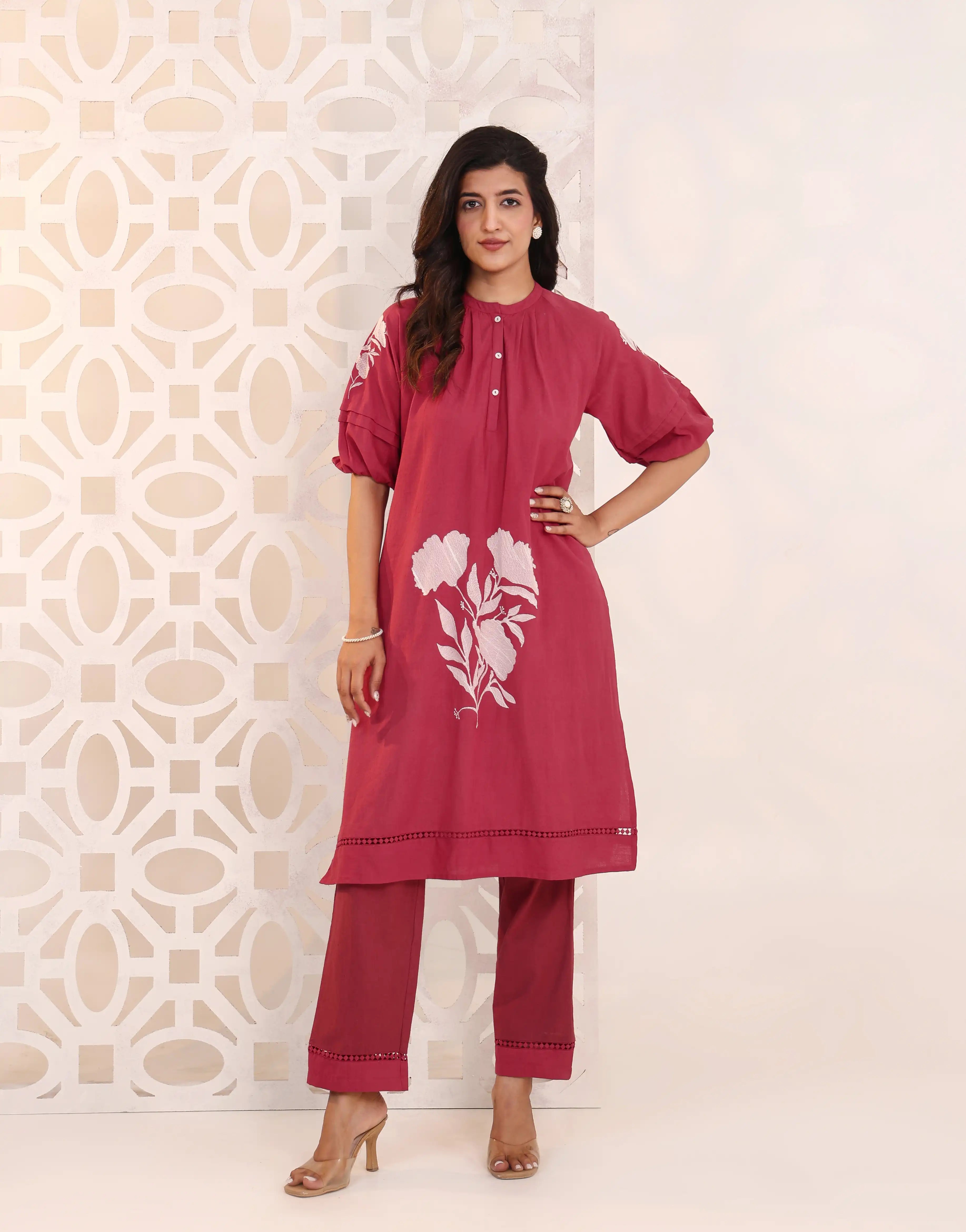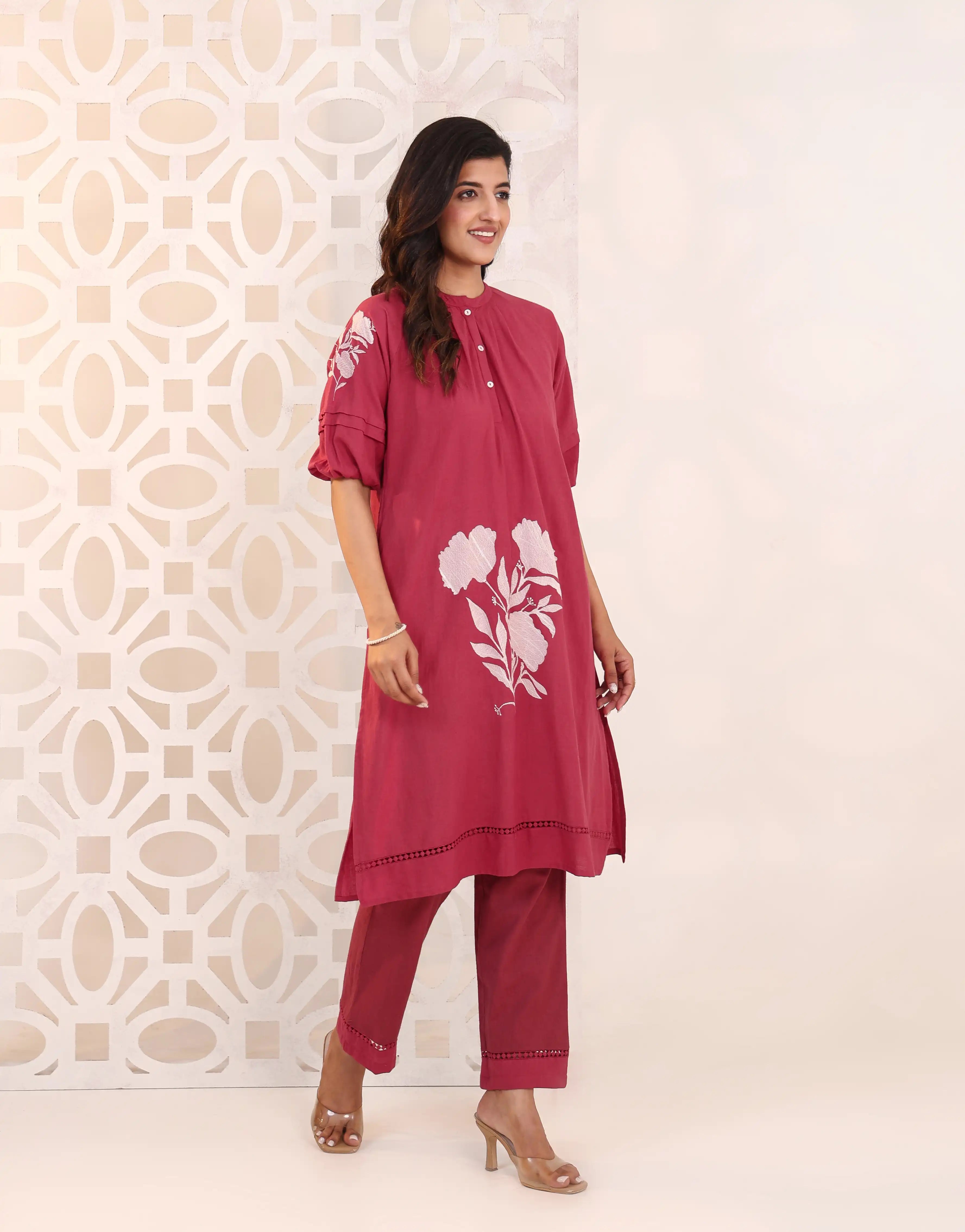 Vibrant and elegant, the RIMAYA Rose Red Kurta Set features intricate floral embroidery, soft pleat details, and a flattering silhouette—perfect for festive evenings, family celebrations, and joyful gatherings.