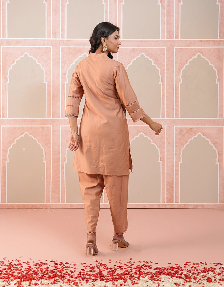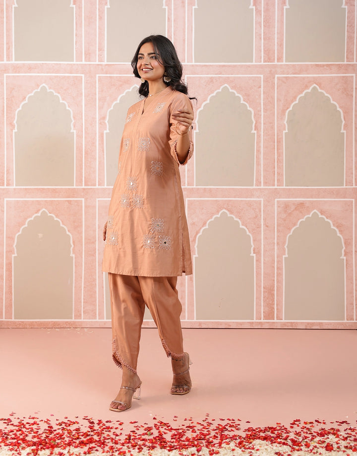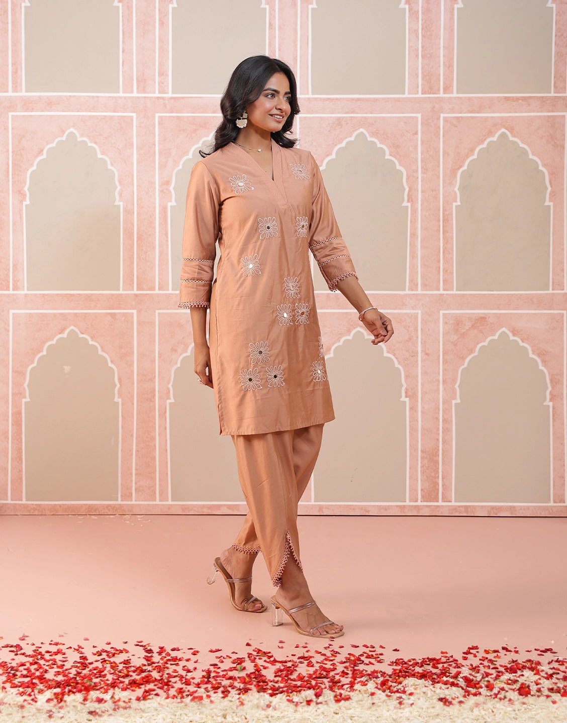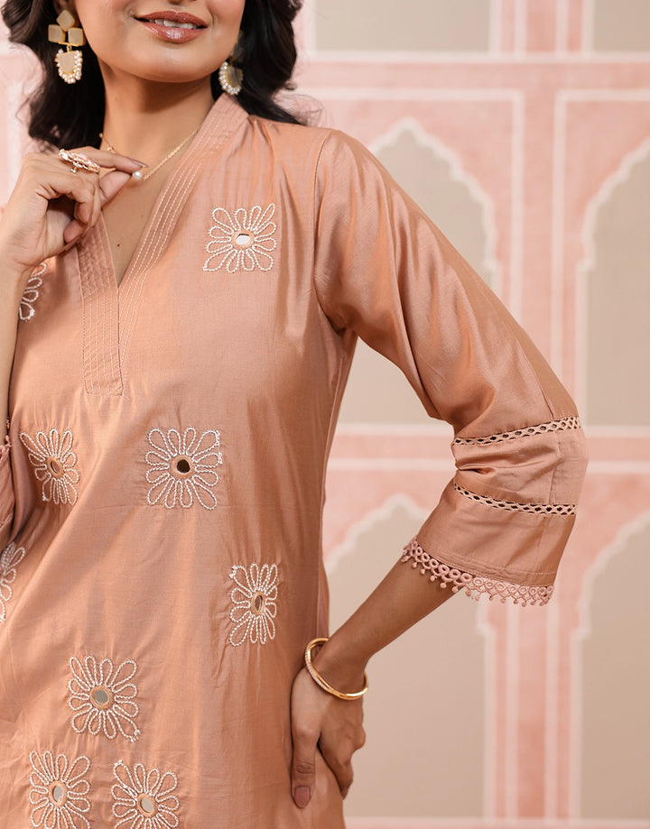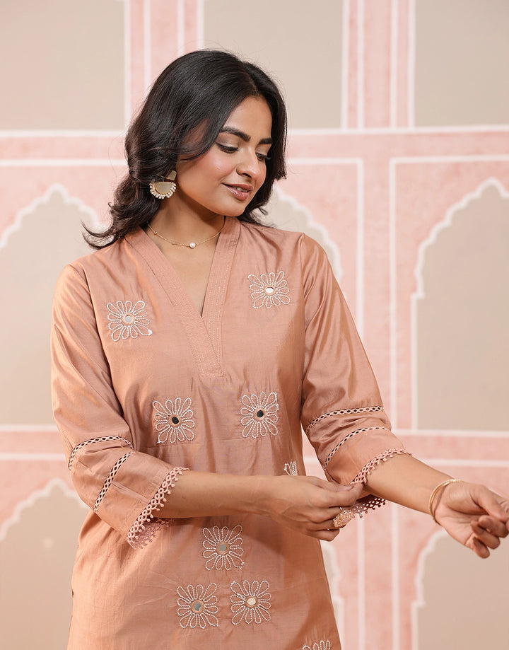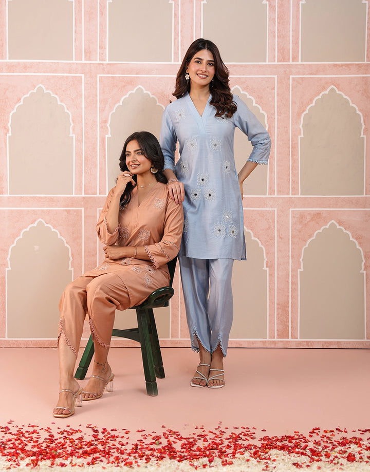 The Sanika Brown Embroidered Kurta Set features delicate floral embroidery on soft cotton fabric. With its earthy brown hue, V-neckline, and comfortable fit, this stylish set is perfect for festive gatherings, office wear, or everyday elegance.