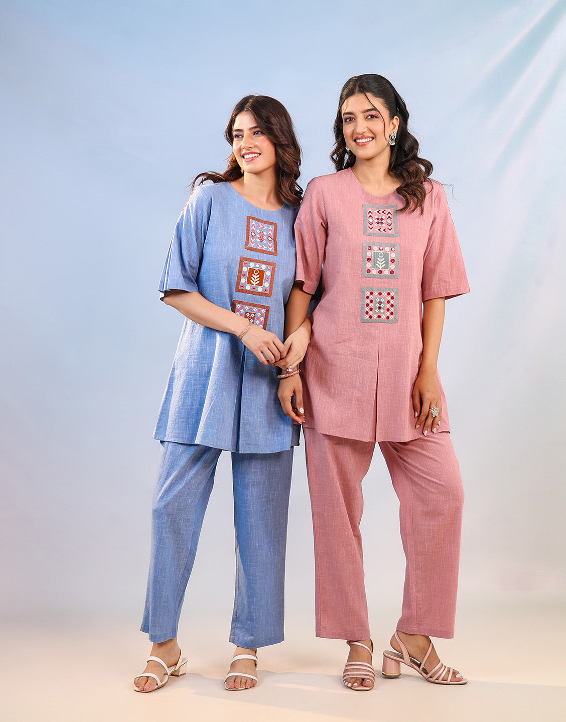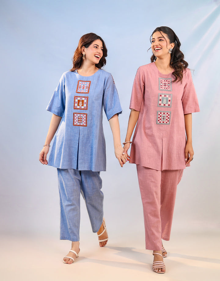 Playful yet elegant, the SONIYA Pink Co-ord Set features statement patch embroidery and a modern fit—perfect for festive days and casual celebrations.