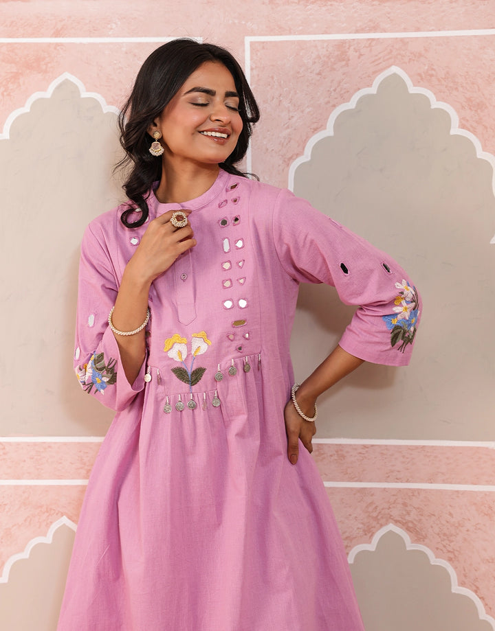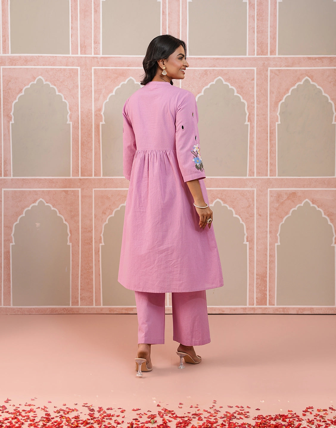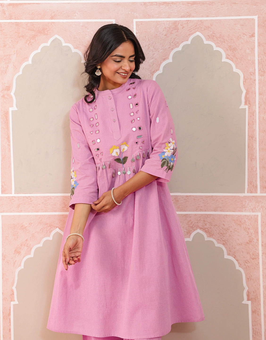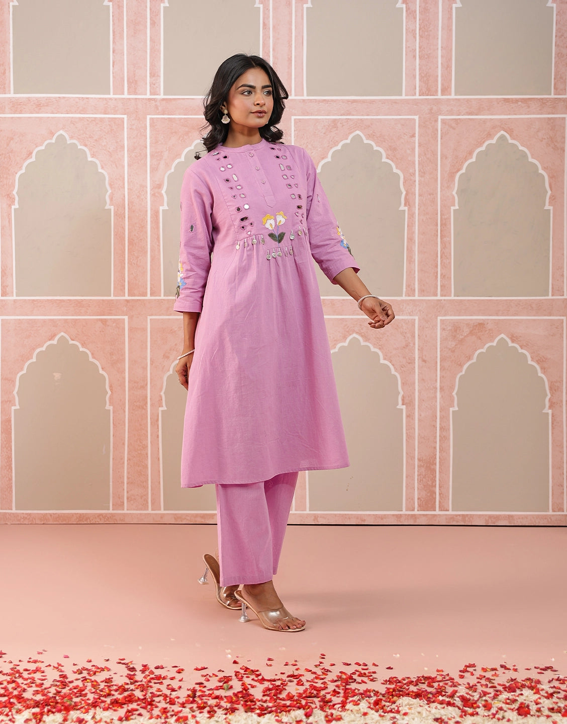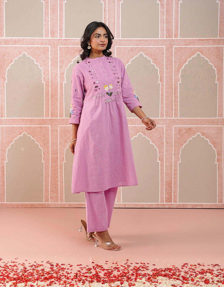 A radiant blend of mirror embellishments and delicate purple floral embroidery, this kurta set captures graceful elegance with a contemporary ethnic touch.