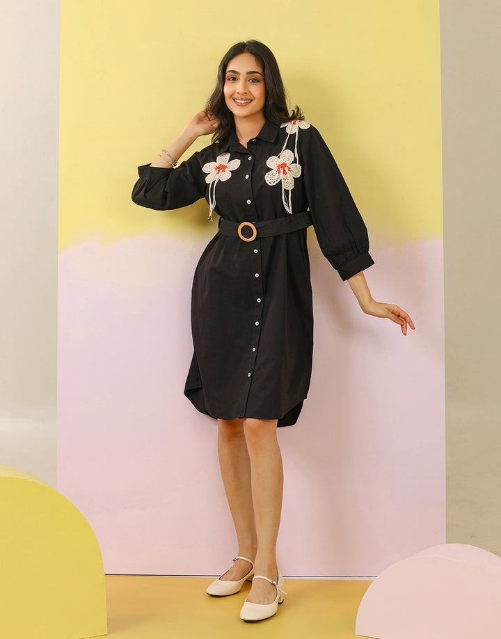 The Tilly Black Dress, designed to make a statement with its rich hue and intricate detailing. Delicately handcrafted crochet flowers adorn the shoulders, A matching waist belt cinches the waist beautifully.