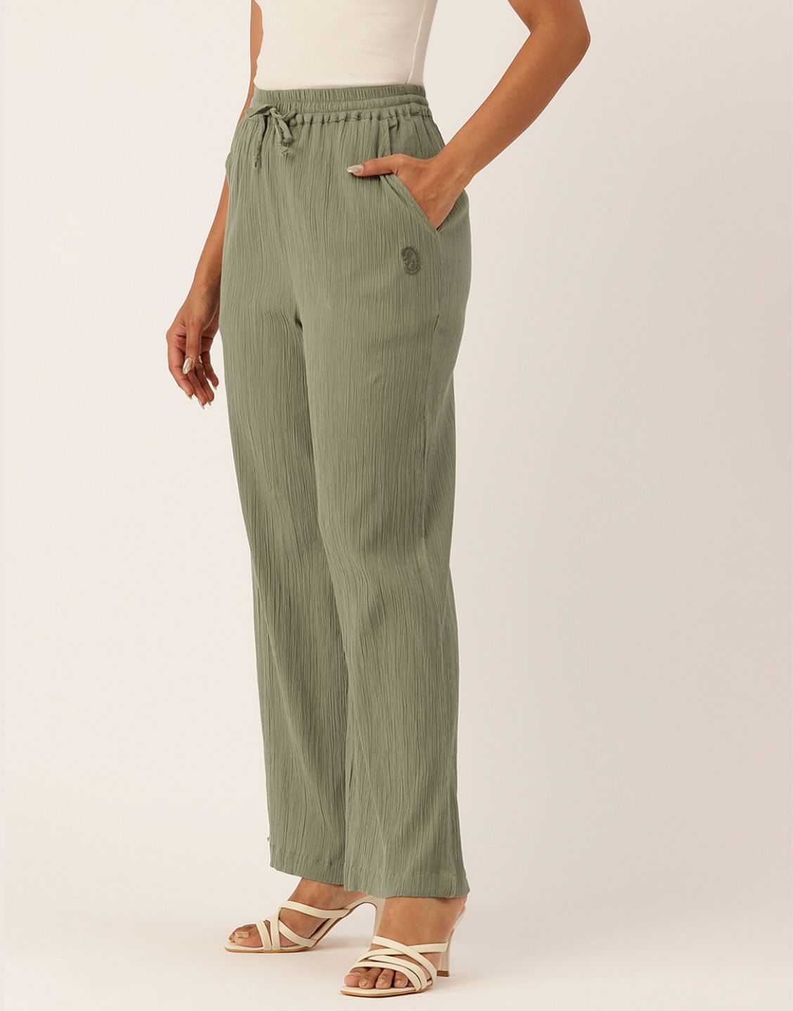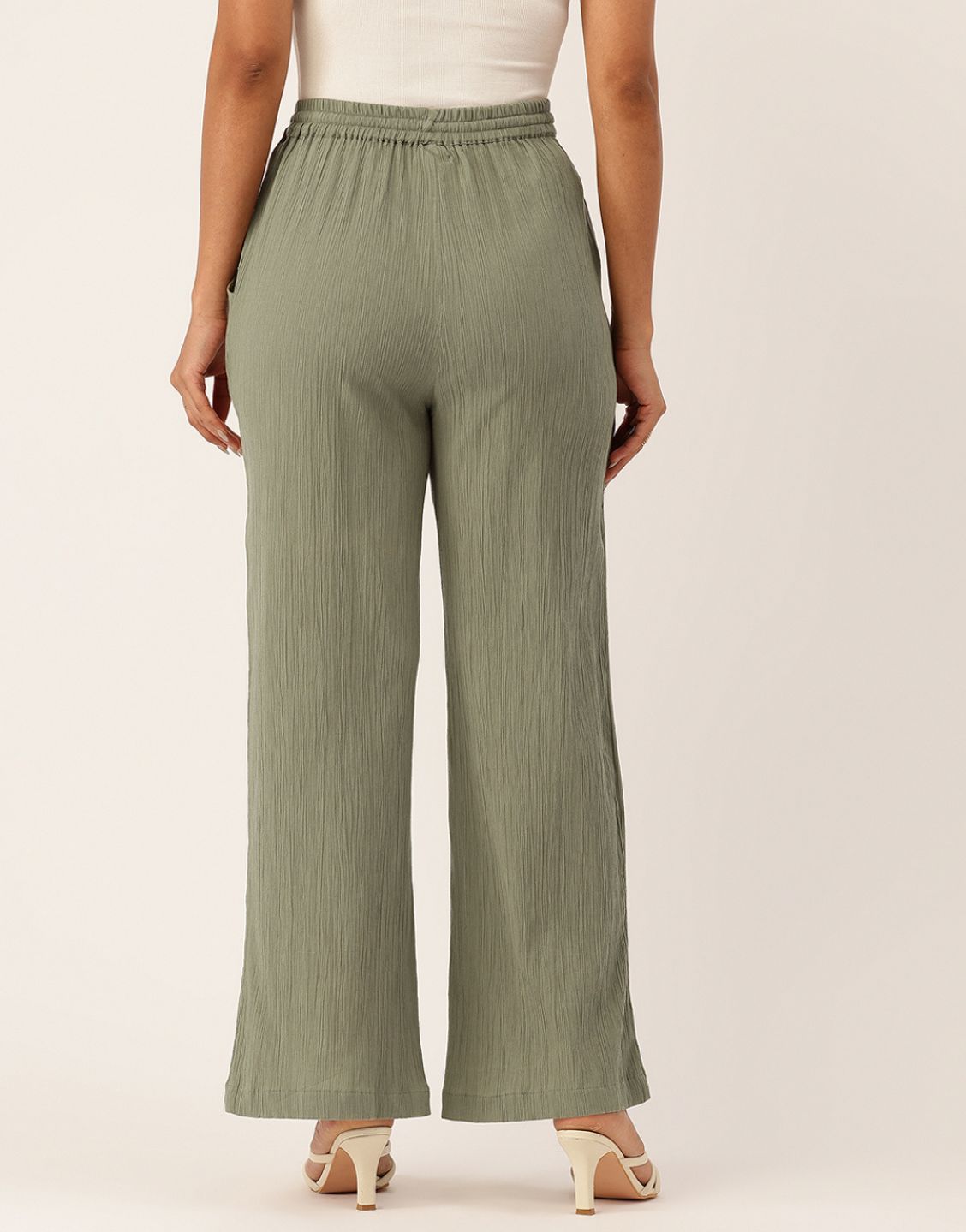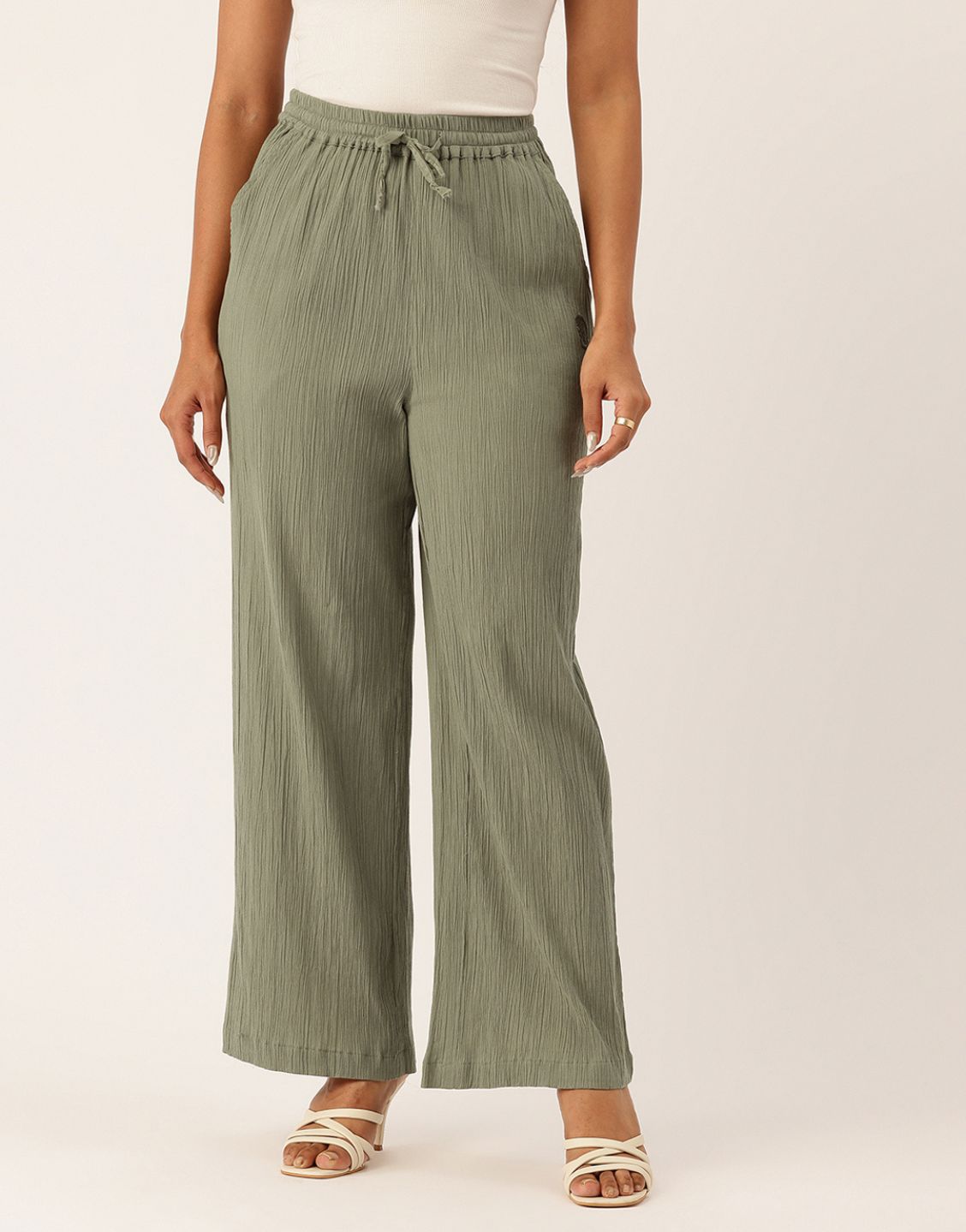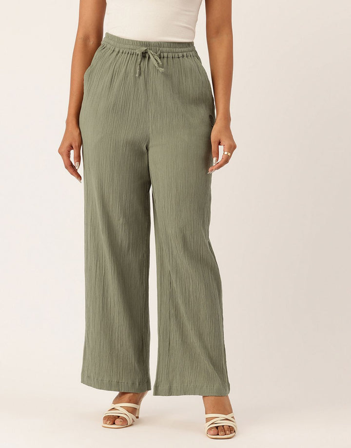 A Vistara green wide-leg pants with a crinkle texture and drawstring waist for effortless everyday comfort and style.—Perfect for casual outings, travel, or lounging.